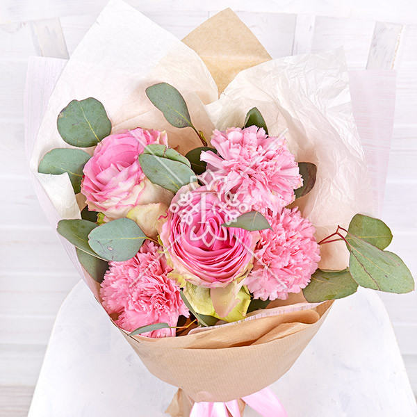 Классические одноголовые розы,  воздушные гвоздики и нежная зелень эвкалипта… соединяясь в волшебном цветочном аккорде, эти цветы выглядят весьма привлекательно!